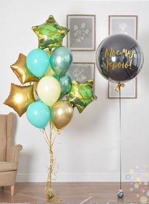 - Букет на грузике каждый из 2 зеленого, 2 золотого хрома, 3 айвори, 3 бирюзового декоратора (высота 34 см, диаметр около 26 см), 2 звезды золото сатин (45 см), 2 звезды "Камуфляж" на выбор