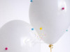 - Белый шарик "Весёлые помпончики" размера М (высота 34 см, диаметр около 26 см) с маленькими шариками на ленточке на своем грузике