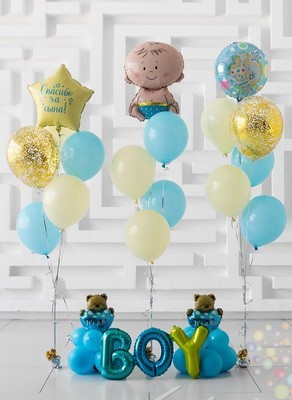 - 1 букет из 2 голубых шаров, 2 шаров айвори ( высота 34 см, диаметр около 26 см), 1 прозрачного шара с золотым конфетти размера М (высота 42 см, диаметр около 33 см) и 1 фольгированного шара на выбор круг "Это мальчик" (Жирафик) (45 см) или Звезда "Малыш" (45 см)
