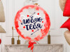 - букет на грузике из 12 бежевых шаров размера М (высота 34 см, диаметр около 26 см), 3 фольгированных красных японских сердец (45 см) и прозрачного шара Bubble с красными перьями по окружности и надписью "люблю тебя"