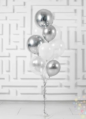 Букет состоит из 3 белых шаров, 3 серебряных хромов ( высота 34 см, диаметр около 26 см), 3 прозрачных шаров со снегом внутри ( размер М - высота 42 см, диаметр около 33 см), 2 шаров-сфер "Серебро" (41 см)
