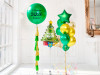 - Букет на грузике состоит из: 5 шаров зеленый металлик, 3 серебряных хромов (размер М, высота 34 см, диаметр около 26 см), 2 прозрачных шариков с конфетти "серебро" размера М (высота 42 см, диаметр около 33 см), 1 фольгированной зеленой сатиновой звезды (45 см);